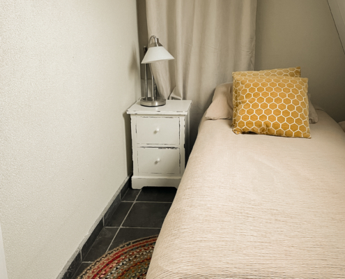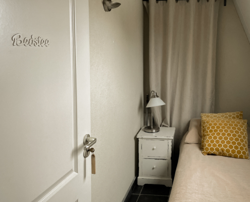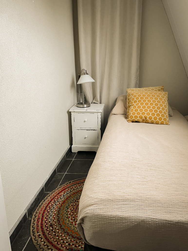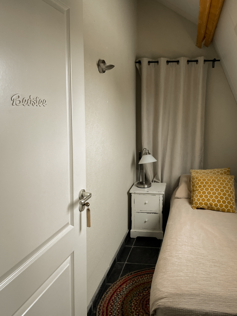 De Bedstee is ons kleinste kamertje, ontstaan vanuit de behoefte om meer mensen een eigen plekje te geven, ivm de huidige maatregelen. Maar zonder dat is het gewoon een lekker klein plekje, voor je oudste zoon, voor degene die net iets meer geluid maakt tijdens het slapen, je kleine zoon of dochter die al in een groot bed kan slapen of voor de extra collega die toch meeging….. Er staat een heerlijke 1-persoonsboxspring in, een klein nachtkastje en is voorzien van een velux dakraam. Het sanitair kunt u gebruiken op een van de andere kamers. Deze kamer is dus alleen in gebruik bij het huren van het hele gebouw door een familie of groep.