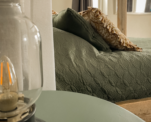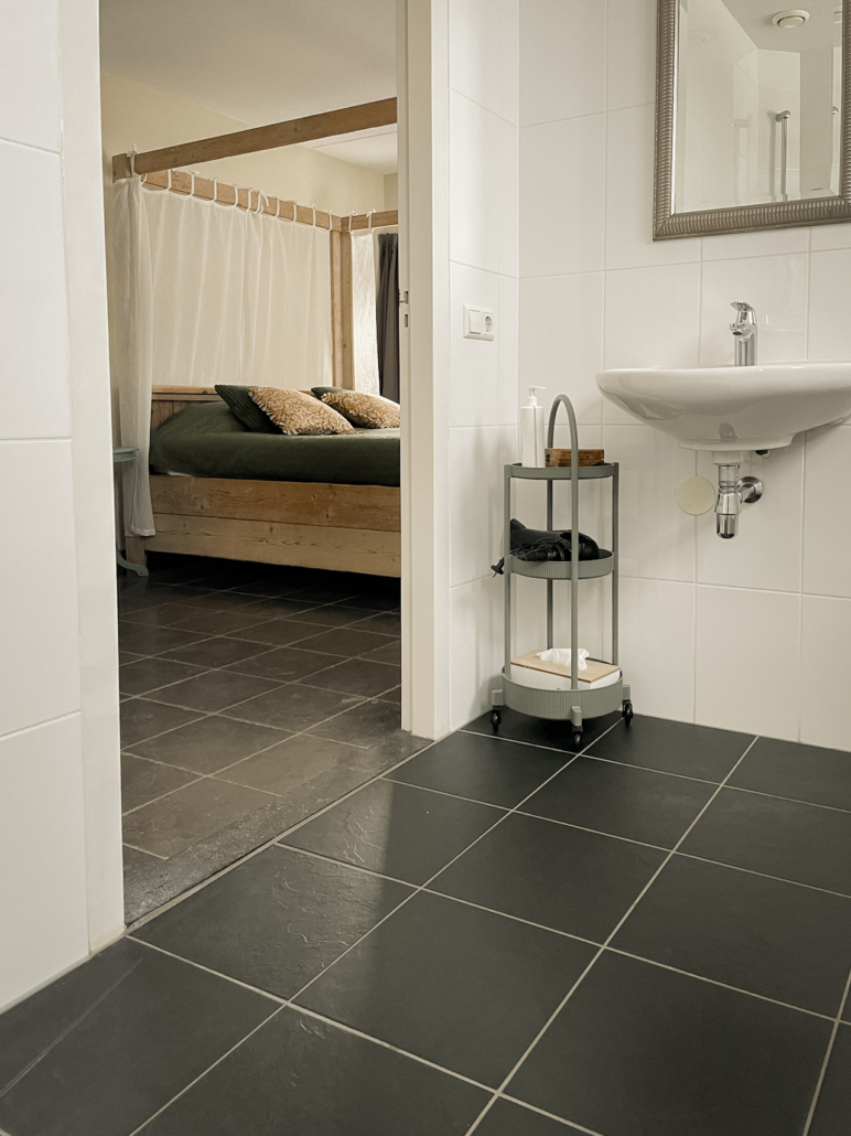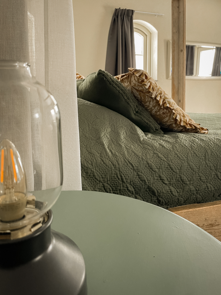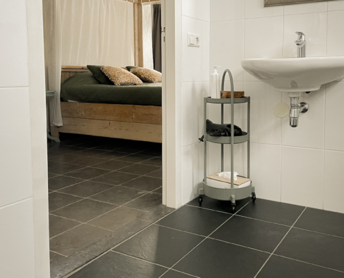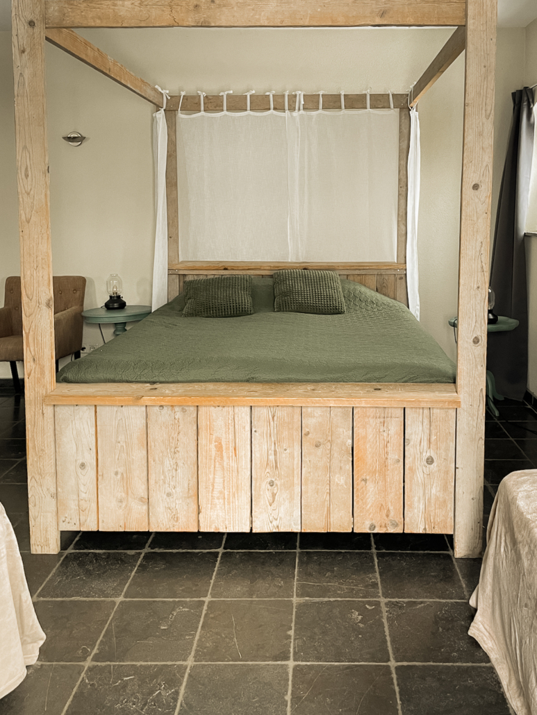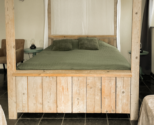 Kamer Lucht is onze meest romantische kamer en beschikt over een steigerhouten hemelbed. Het bed heeft een orthopedisch matras. De kamer heeft naast een tv, een ligbad, douche, toilet, wastafel en is volledig rolstoeltoegankelijk. Het is mogelijk om een douchestoel te plaatsen. Deze is bij ons aanwezig.
